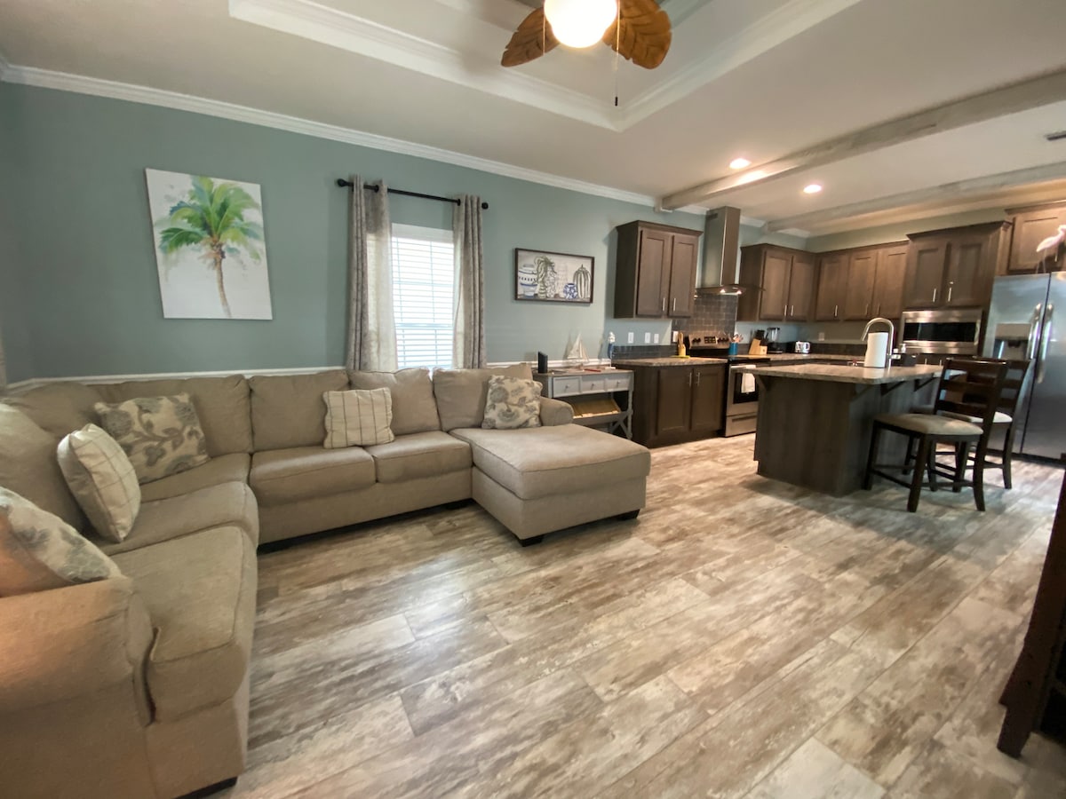 Location, location. Six houses from headwaters of springs. Private suite on the first floor of a new 3story home directly on river. Take a swim, in the crystal clear year round 72deg water. River & dock are right outside your door. Launch your kayak or ours. Visit Rainbow Springs St Pk a quick row up river. Enjoy a float or snorkel trip. Snorkel gear provided. Mini kitchen with refigerator, microwave, toaster, sink, and Keurig coffee pot. Large bar area for dining or work area.