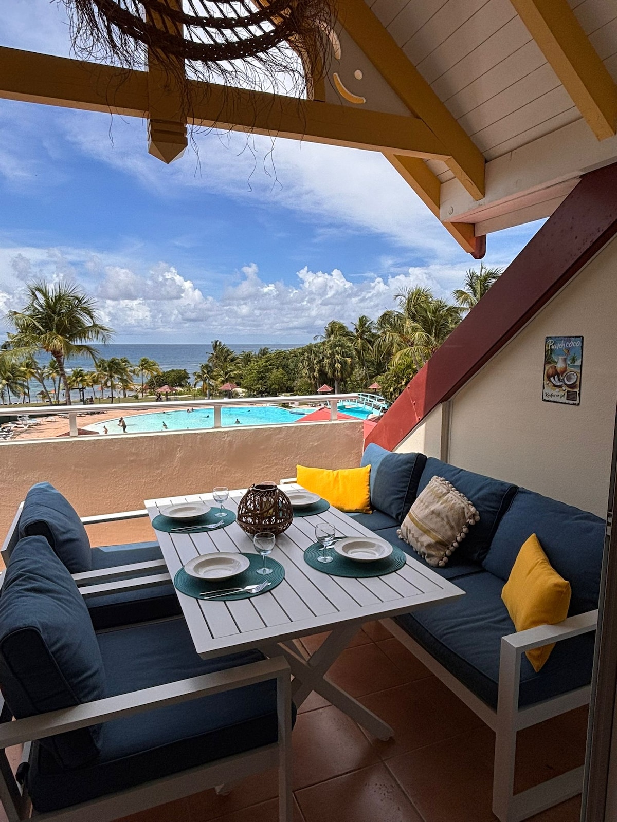🌴 Exceptional beachfront apartment – Sea view & direct access to Raisins Clairs Beach On the 1st and top floor of a secure upscale residence, with shops and restaurants within walking distance Renovated and air-conditioned: 2 bedrooms with storage, modern shower room, separate toilet, fully equipped kitchen (washer, dishwasher, large refrigerator + freezer, Nespresso & Senseo) Spacious balcony with sea and pool views, equipped with a plancha. Private Wi-Fi, TV, parking, 300-L private water tank