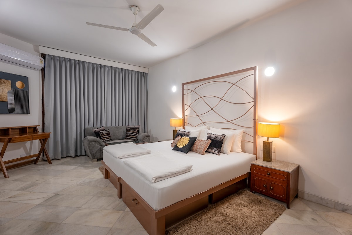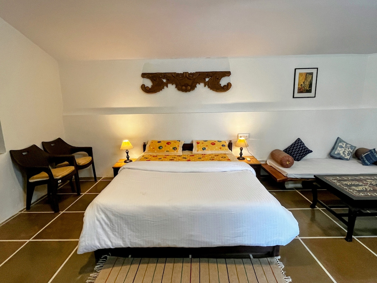 "The Golden Door" is an artistically designed room with an attached bathroom on a private terrace with panoramic views of the Aravali Hills. Ideal for couples, solo travelers, and business professionals, this accommodation seamlessly blends aesthetics and functionality. Its central location grants easy access to major attractions. In essence, "The Golden Door" transcends conventional stays. With its central location, artistic design, and comfort, it provides a simple yet unique stay.