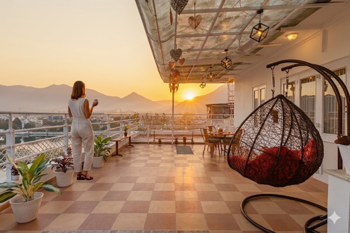 Wake up above the city to uninterrupted sunrise views over Udaipur’s lakes, hills, and skyline-right from your private terrace. Set atop a charming hill in the heart of the city, this boutique 2BHK Suite offers a rare blend of space, privacy, and calm-just minutes from the lakes. Perched on the top floor of Hill Villa Signature Suites, the experience extends into beautifully designed shared decks, lounge spaces, and a wellness zone with jacuzzi & steam for a relaxing unwind.