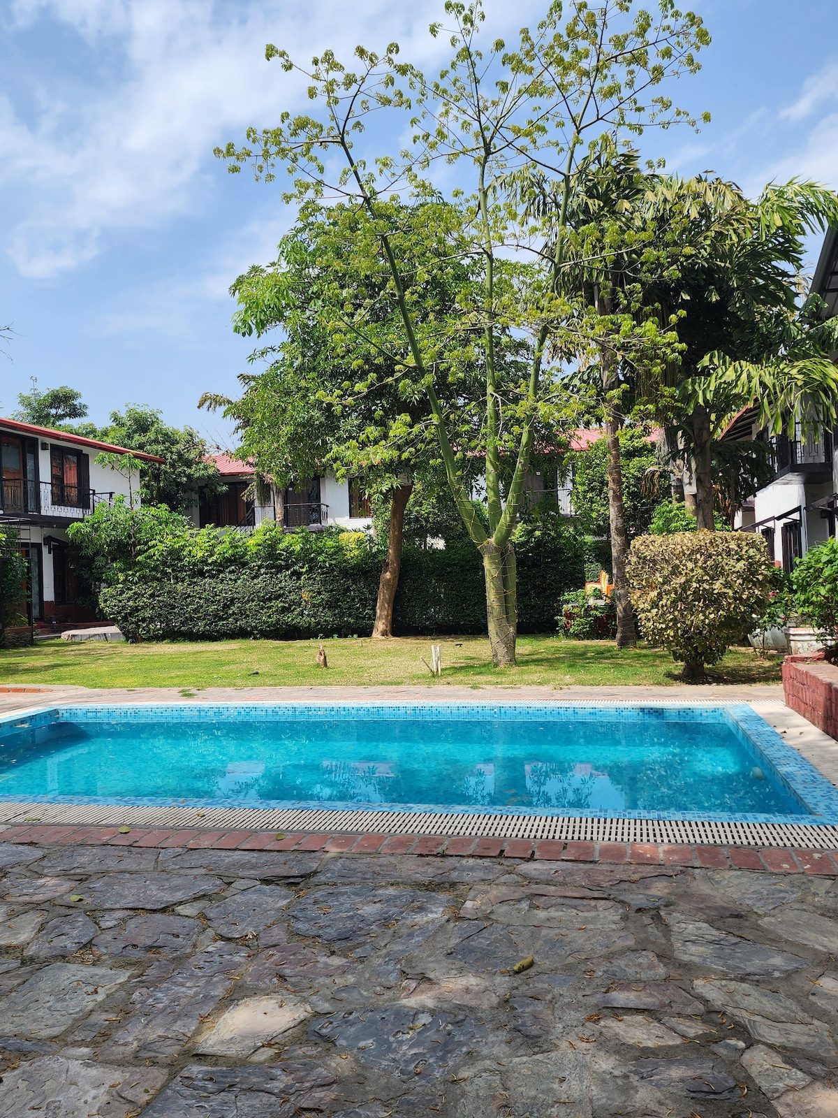 It is a lush green resort with lot of trees and a view of Aravali Hills keeping nature in mind. It is an ideal place for HOUSE & POOL PARTIES, EVENTS & WEDDINGS. Rooms, Lawn,Pools,Spaces available as per your requirement. We are Pet Friendly and allow Music to be played on Party Speakers and can also arrange DJ setup, Catering, Decor, Photography etc. You can also Enjoy the Luxurious Lawn for Playing any kind of Sports or just go for a walk out in the Natural Environment of the Property.