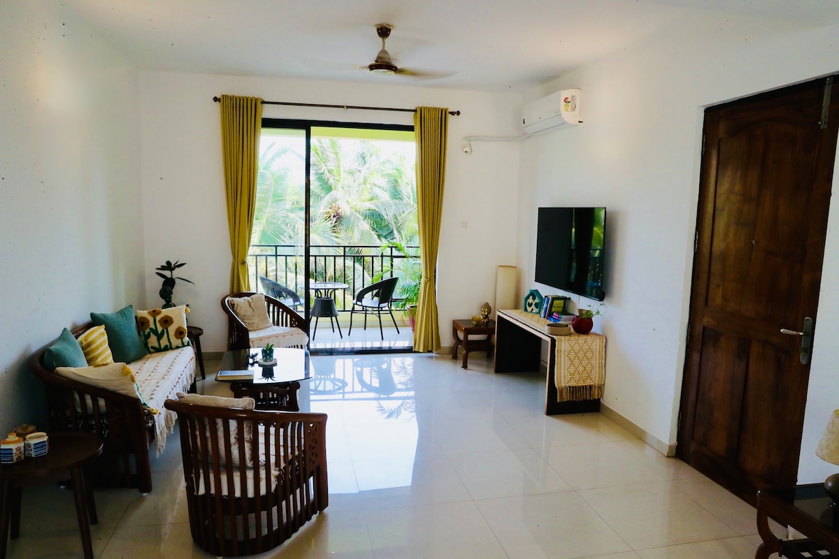 Fully furnished, beach-side apartment in South Goa, with living room, 2 AC bedrooms, 2 washrooms, 3 balconies, TV, workspace, power back-up, washing machine, RO water, microwave, induction plate, fridge, cutlery, crockery, utensils, toaster, kettle, locker etc. Campus has gym, children's play area, walking track & parking. Apartments 1, 2, 3 & 4 are identical. Wi-fi with 25mbps speed and unlimited GB part of package. Guests can buy up to 100 mbps speed at additional cost.