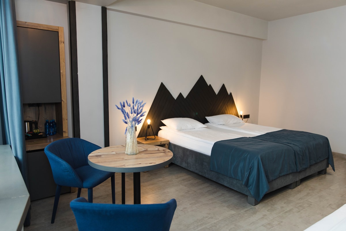 Наші стандартні апартаменти у Mayak Apart Hotel створені для комфортного відпочинку 2-3 гостей. У номері 2 односпальні ліжка (можна зсунути) та футон, міні-кухня, Smart TV, Wi-Fi та власна ванна кімната. Лише 10 хв до Буковеля! Панорамний вид, свіже повітря та природа навколо. Чан на території – ідеальний релакс після активного дня. Затишна атмосфера, де можна насолоджуватися горами прямо з вікна. Ми знаходимося в тихій частині Яблуниці, але в зручній близькості до основних туристичних локацій.