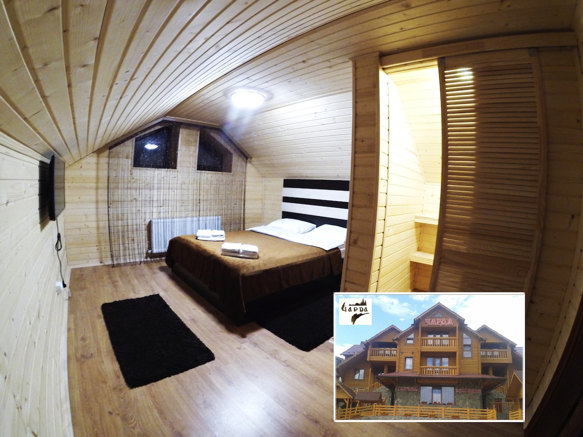 Welcome to Carpathian! Here you can enjoy the fresh air and the beauty of Carpathian mountains. We offer a comfortable hotel room with one bedroom, living room, and a private bathroom. In the apartment, it is possible to accommodate up to 2 adults with 2 children (on a sofa at the living room) You can enjoy traditional Ukrainian food in the restaurant which is a part of our hotel.