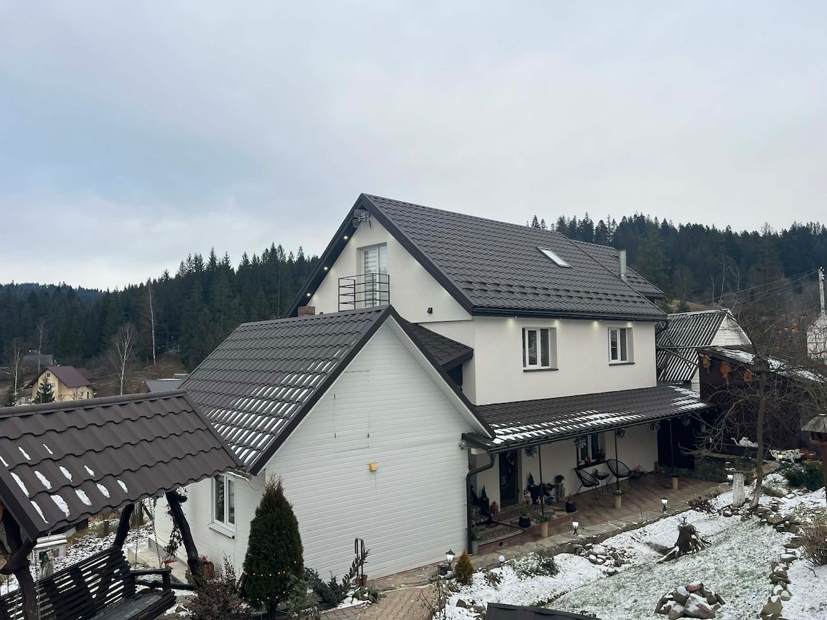 " Видовий" в центрі с. Поляниця із захоплюючим видом на підйомники та всю красу Буковеля. Велика тераса з каміном всі зручності для комфортного відпочинку сім'ї чи компанії. Баня в будинку. Безкоштовна паркування та Wi-Fi. В будинку 3 поверхи , 4 окремі спальні та велика вітальня з каміном та великий розкладним диваном + телевізор і супутниковими каналами, обідня зона, 5 санвузлів , обладнана кухня та тераса з видом на гори.