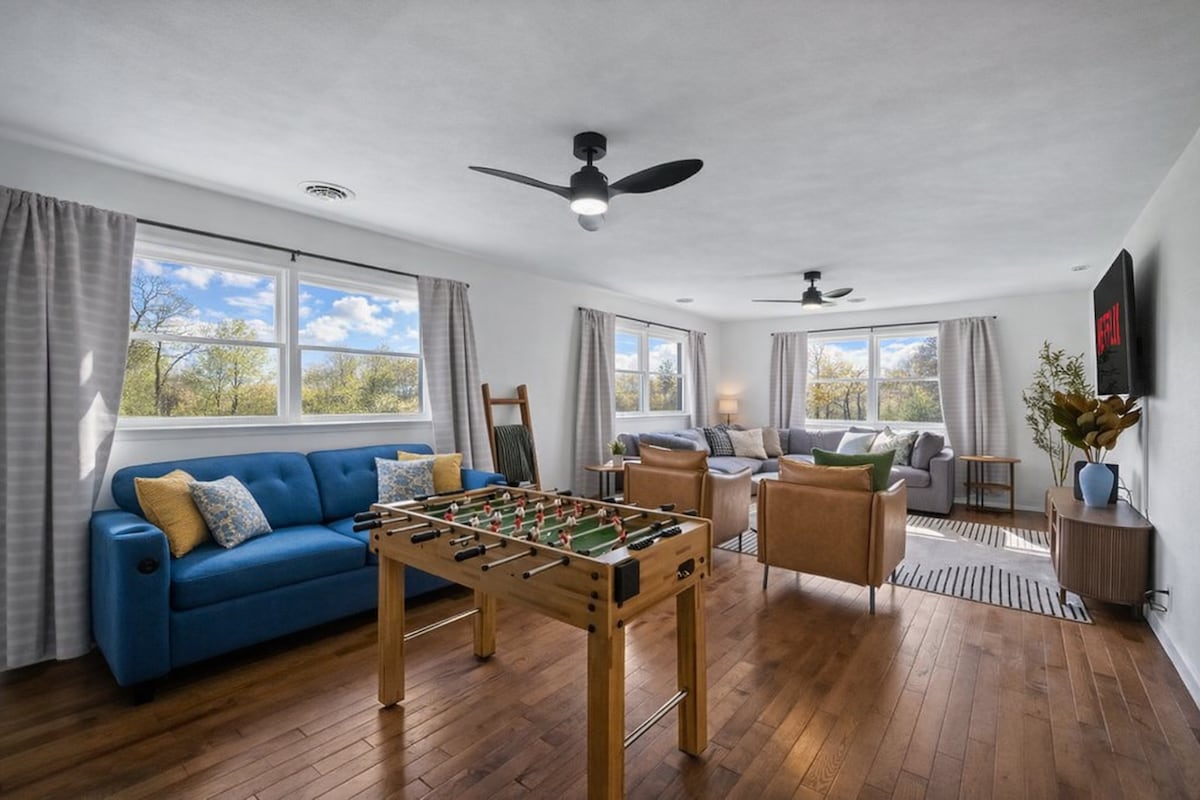 Stylish, spacious retreat designed for comfort and group stays, sleeps up to 16! Features multiple bunk rooms, cozy queen bedrooms, a warm, modern living area, and a fully styled dining space. Enjoy a dedicated coffee bar, inviting outdoor area with firepit and string lights, and thoughtful design touches throughout. Perfect for families, friends, or getaways seeking comfort, style, and a memorable stay.