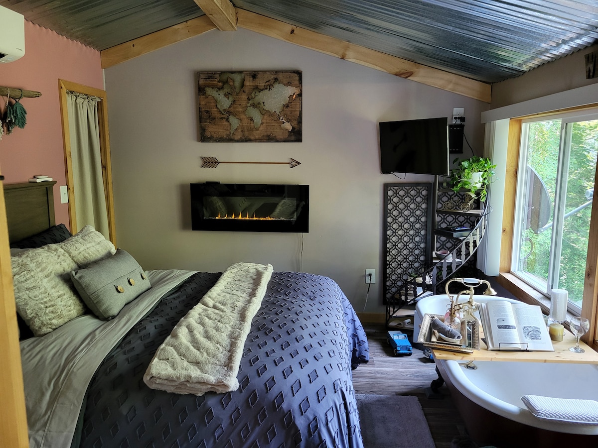 Take it easy at this unique and tranquil getaway. Eclectic 1 room home, full kitchen, and private bathroom. Two queen beds, second one is in the loft accessible by ladder (climb at your own risk). Apartment sized appliances, washer/ dryer, and large outdoor covered patio with a grill. Newly remodeled. Air conditioning. Located 23 miles away from New River Gorge National Park and close to many other state parks and outdoor recreational activities. Central to shopping, restaurants, and night life.