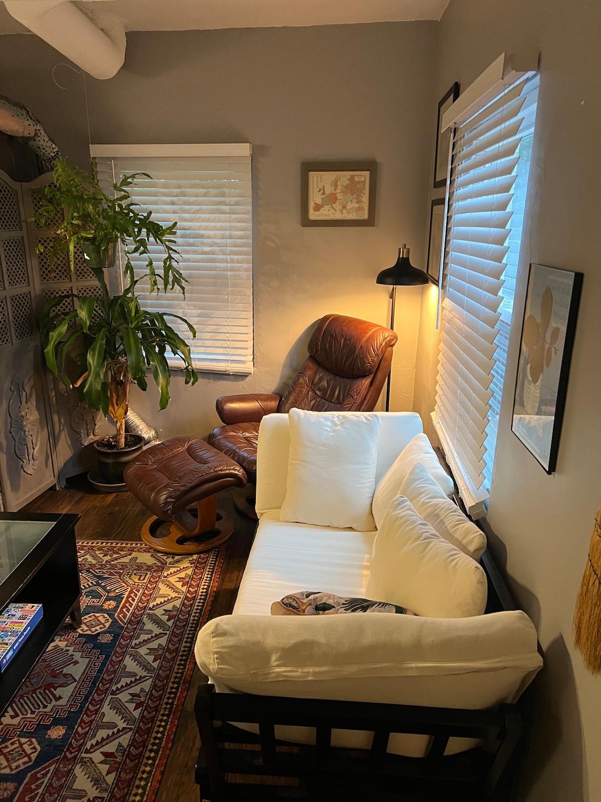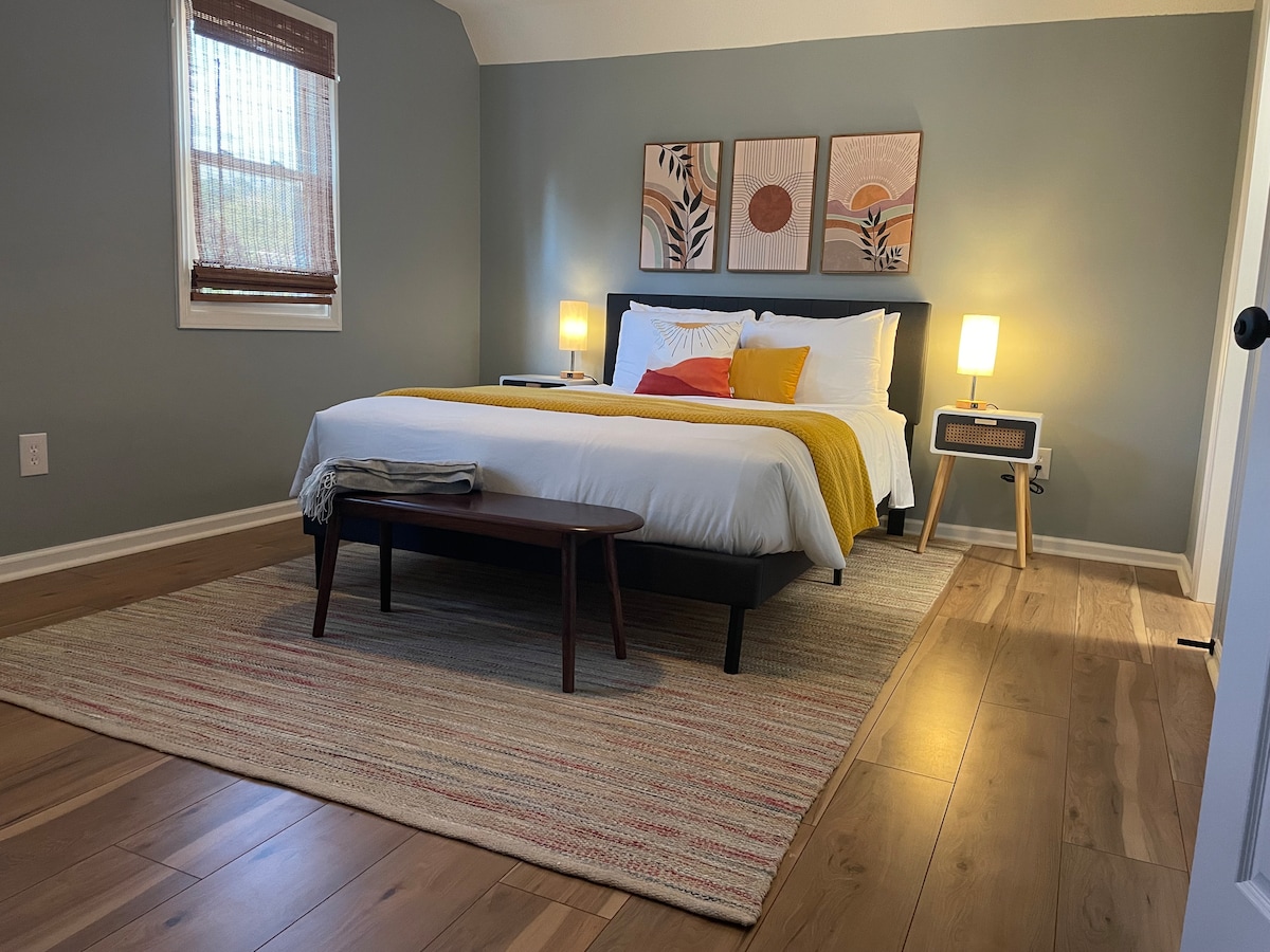 Welcome! Our Boho suite is spacious, cozy, and private with gigabit fiber internet. Private entry, too! In the living room, you can watch Netflix on TV or work at the desk. Then when it's time for sleep, you can move to the bedroom, shut the barn door, and curl up in bed. Wake up refreshed in the morning with our coffee station (Keurig, fridge, & microwave). We're located in a safe, quiet neighborhood that's a short drive to anywhere in the Triangle. We'd love to host you!