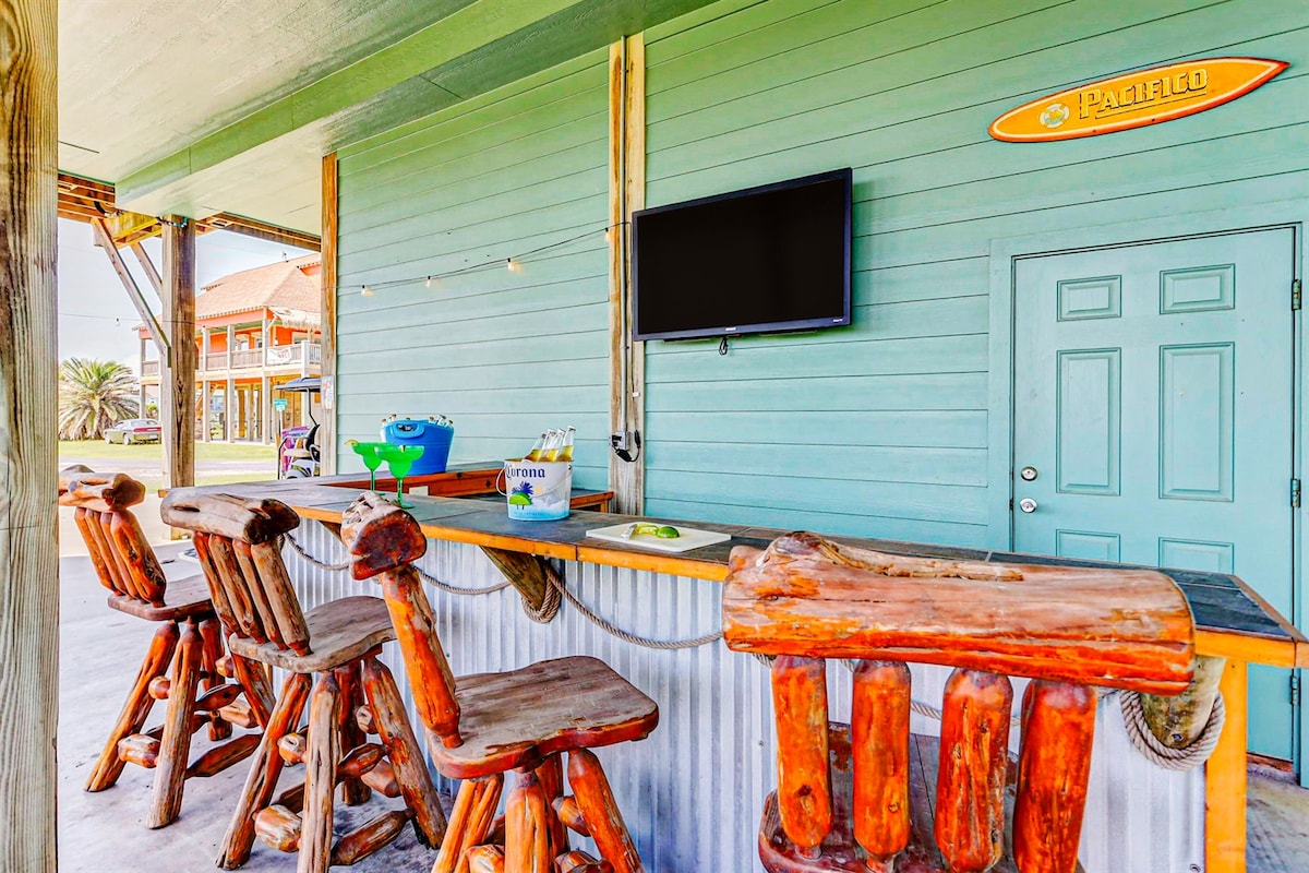 Relax or play at Crystal Beach...walk along the beach or grab a bite to eat. Everything from this Beach house on Bolivar Peninsula is centrally located on the Peninsula. Play games with your family in the tiki bar area - have a BBQ - or just talk and relax. You can drive along the beach, and if you purchase a pass you can park your car on the beach. Feel free to build a fire, a bbq, stretch out in the sun, build a sand castle, or even fish.