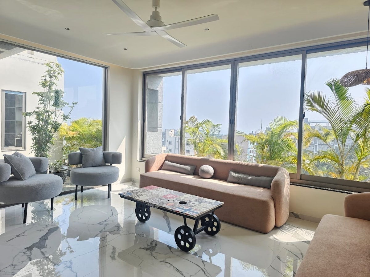 Take it easy at this unique and tranquil getawWelcome to your private premium retreat. This beautifully curated 1BHK apartment is designed to offer comfort, privacy, and a touch of luxury—making it an ideal escape for couples seeking a peaceful and stylish stay. The apartment features a spacious bedroom, thoughtfully furnished with a comfortable bed and calming interiors to help you unwind after a long day. The living area is cozy yet elegant. The modern kitchen is well-equipped for cooking.