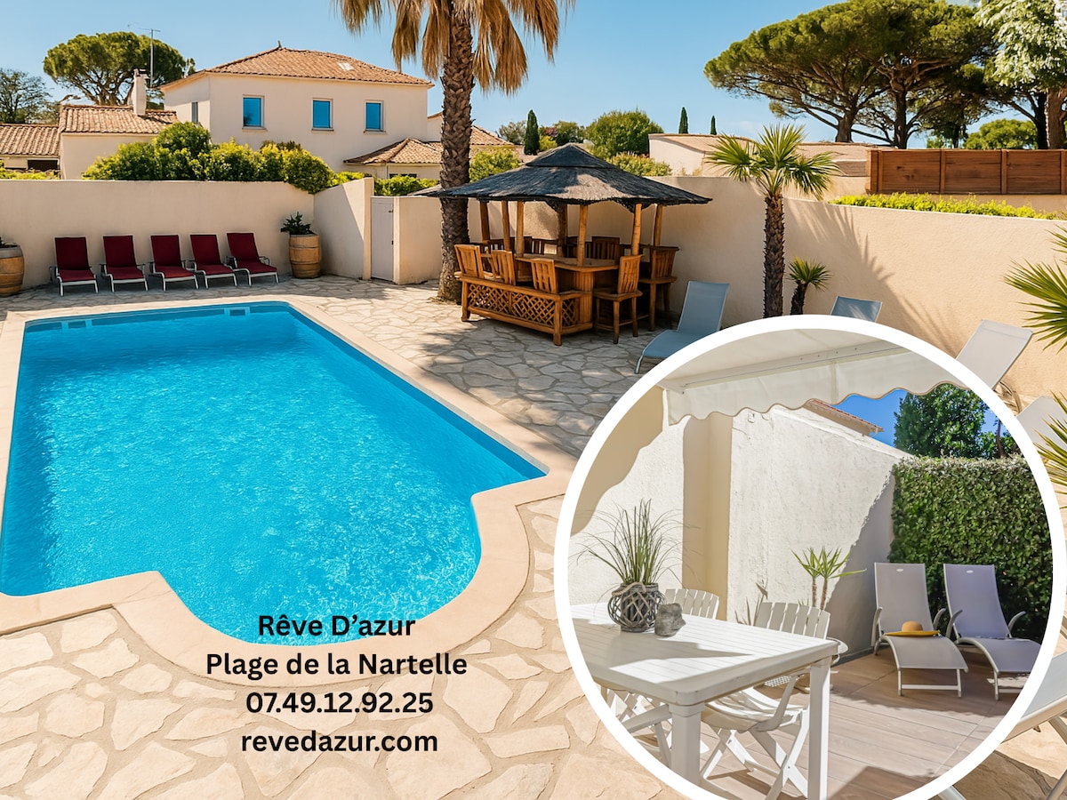 Jolie maison de 65m2, entièrement climatisé, comprenant au RDC: une grande pièce à vivre avec coin cuisine, salon et salle à manger, un wc. A l’étage: 2 chambres dont une avec terrasse, salle de bain et wc séparé. En extérieur, jolie et grand jardin avec PISCINE PRIVÉ(non partagé)transats à disposition. Terrasse abritée avec coin canapés. Table à manger et parasol. Barbecue à charbon. Petite maisonnette d’extérieur pour enfant « à partir » de 3ans. Possibilité d’un bébé en plus des 4voyageurs.
