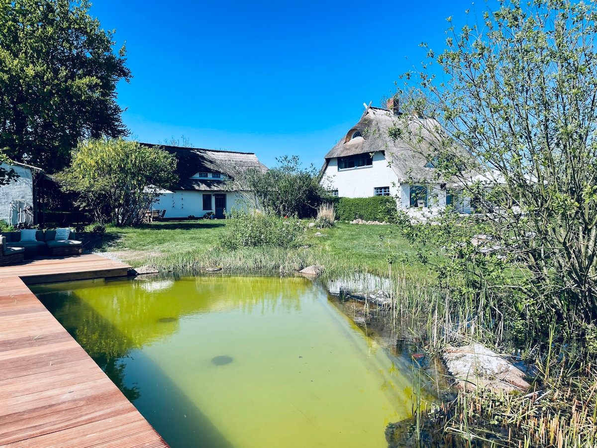 Our two identical holiday cottages are located in a separate building next to our main house, each with its own private entrance – quiet and private. The sauna is right next to the natural swimming pond and can be used freely, with towels and bathrobes included. The pond is perfect for cooling off after the sauna. Centrally yet peacefully located, directly by the Small Jasmund Bodden and next to a large nature reserve.