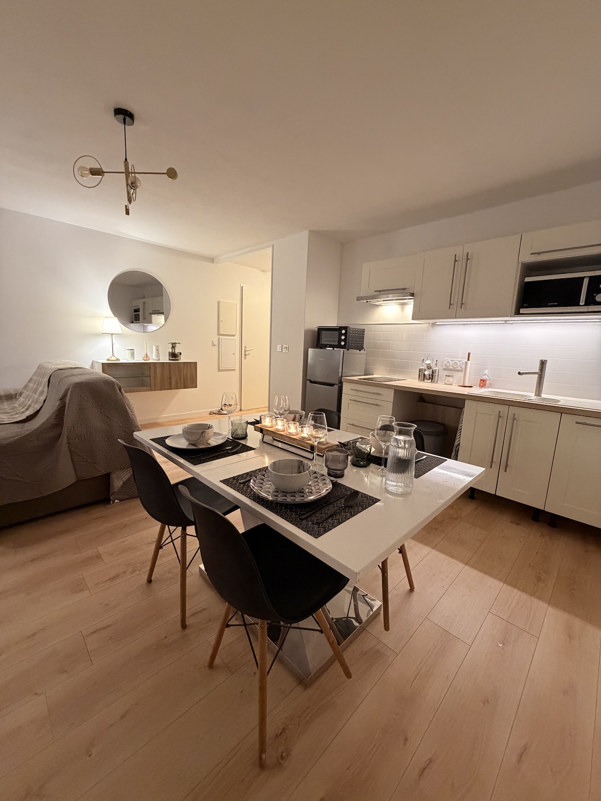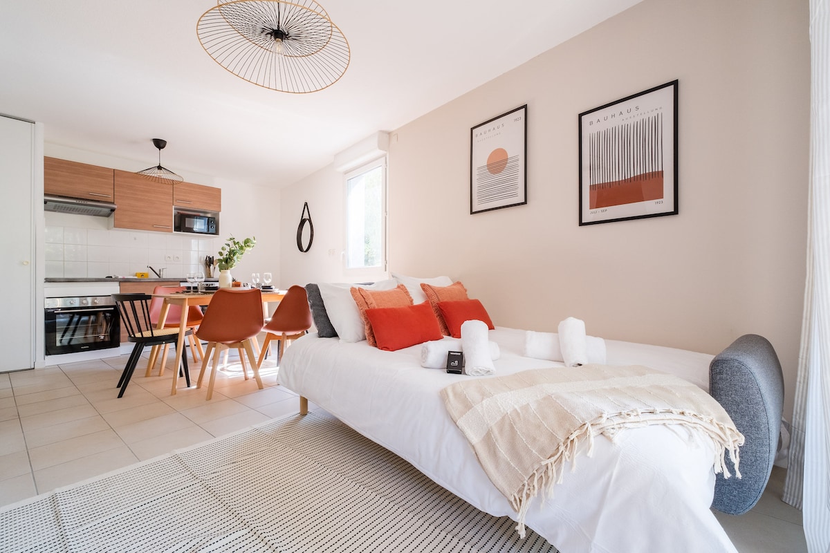 Our aim is to provide travelers with the best possible accommodation within a reasonable budget. Our 16m² studio, though simple, is highly functional and has been completely renovated in 2023. It is conveniently located within walking distance of all necessary shops. You can check-in at your convenience, park temporarily in front of the door to unload your luggage, and then find nearby free parking. Bus lines L109 to Labège or L6 and 81 to Toulouse via the metro are just 100 meters away