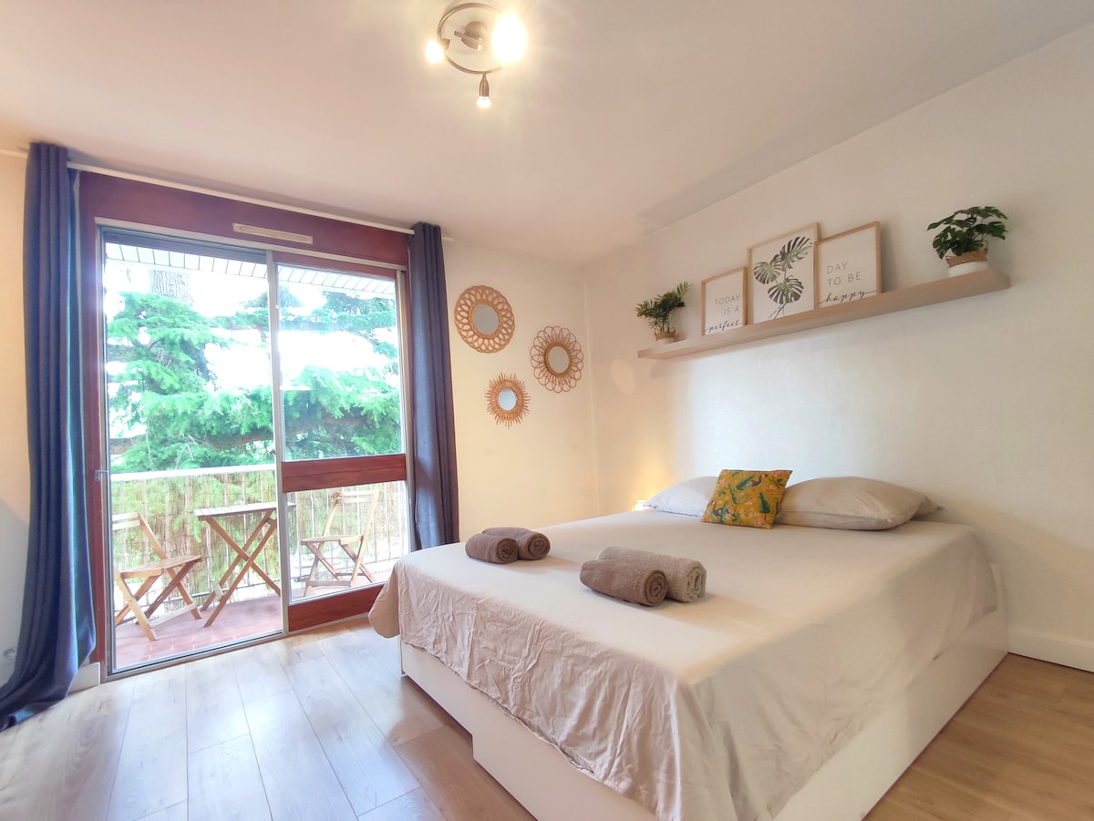 Grand appartement de type 2 de 36m² entièrement équipé refait à neuf récemment. L'appartement se situe dans une résidence calme et très arborée .............................................................................................................................. -Boite a clef pour une entrée en toute autonomie Arrivée à l’heure de votre choix à partir de 16h -place de parking privée -cuisine entièrement équipée -tv connectée -linge de lit et serviettes OFFERT -café the savon