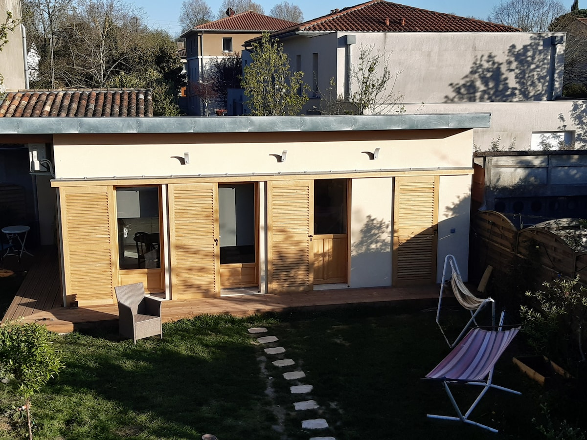 15 minutes à pied stadium. Guest house, jardin intime avec jacuzzi privatif et couvert, accessible toute l'année (piscine mai/sept). Idéal pour découvrir Toulouse tout en étant au calme. Stationnement facile et gratuit, proche centre-ville. Petit-déjeuner offert -mais non servi- la 1ère nuit. Cuisine équipée. Cosy guest house surrounded by a lush and private garden with pool to relax in serenity. Spacious and modern studio includes queen-size bed and a fully equipped kitchen.