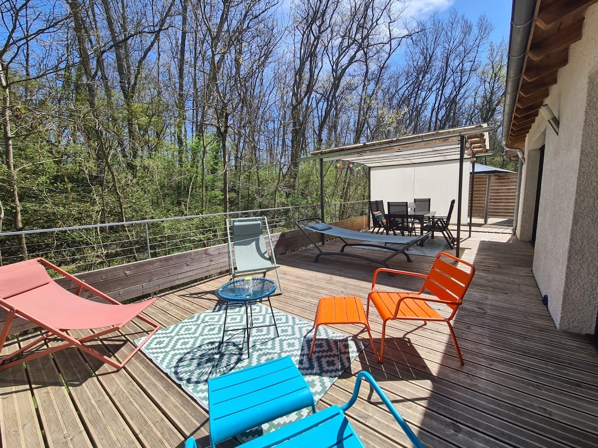 Les amoureux de la nature trouveront leur bonheur dans la maison COSMOS de 45 m2 en lisière de forêt. Vous profiterez du calme et de la verdure à 14 kms au N/Est de Toulouse. Le village est idéalement situé entre Labège Innopole et Blagnac. Balade dans le bois à côté. Pour vos sorties culturelles vous êtes à 20 mn de la cité de l'espace et de Aeroscopia. Albi est à 40 mn (Cathédrale classée au patrimoine de l'Unesco) A 1h la cité de Carcassonne, Revel et son marché et le bassin de St Férréol.