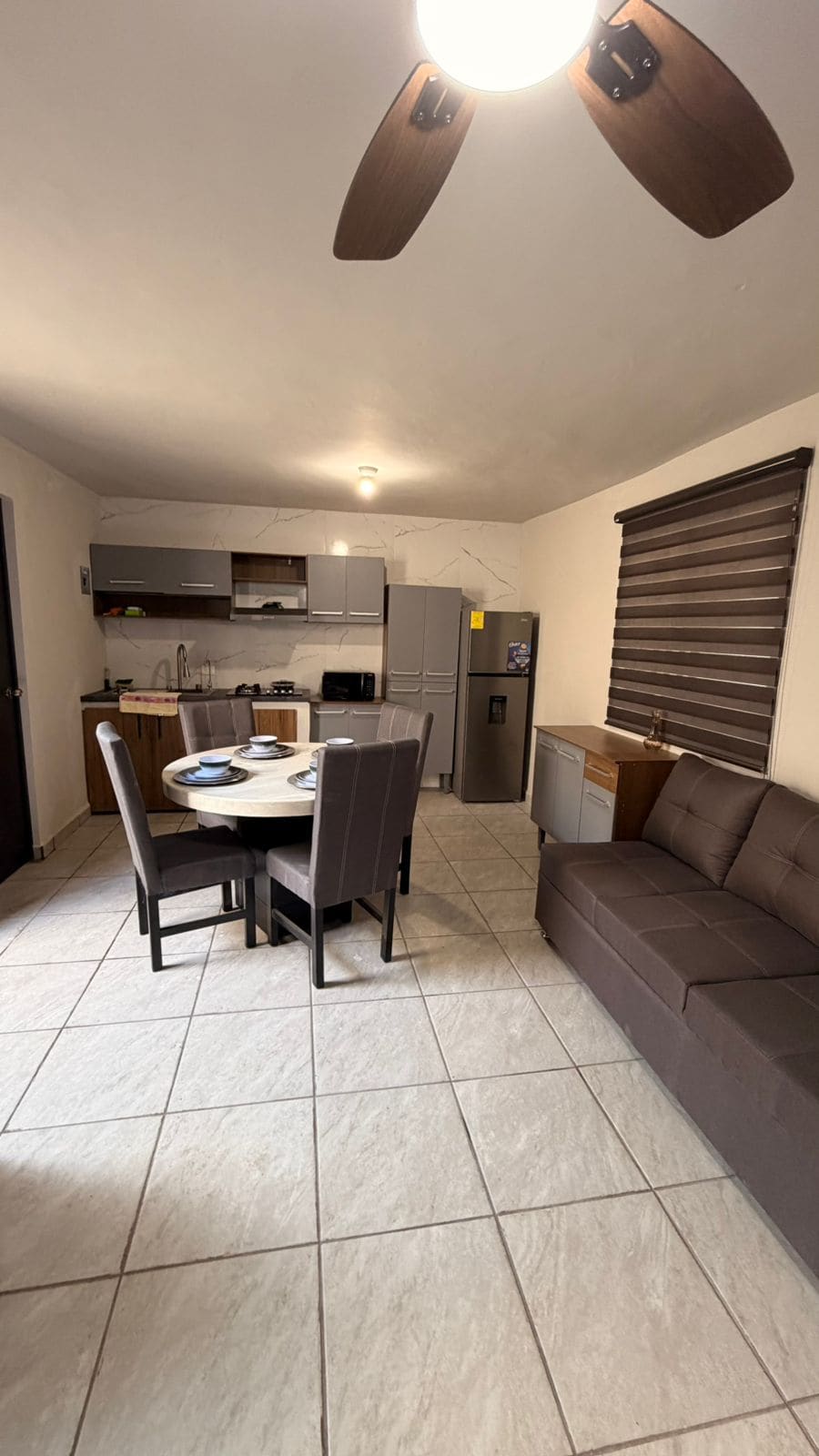 Nuestro departamento esta ubicado en primera planta Facil y Rapido Acceso La entrada es autonoma, por lo que puedes ingresar y salir dentro del horario establecido de 2pm a 10am Inmejorable ubicacion a una cuadra de una de las avenidas principales de la ciudad y a solo 5 min del centro de la ciudad Esta en una zona tranquila y segura Equipado con Cocineta y baño completo independiente, no se comparte con otros departamentos Enseres de cocina y blancos incluidos