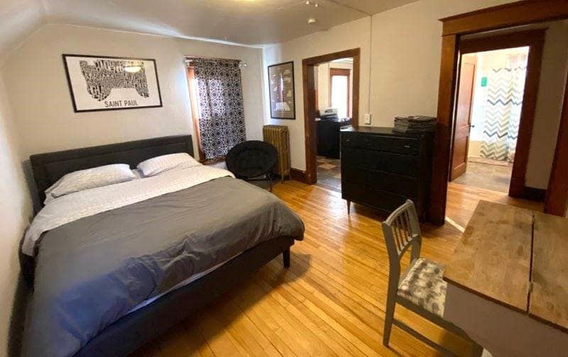 Stylish upper duplex unit newly renovated with private outside entry and street parking. Trader Joe's, restaurants, liquor store and other amenities within walking distance. Closely located to the airport, numerous colleges/universities, Allianz Field, Xcel Energy Center, Grand Avenue, Mall of America, St. Paul and Minneapolis venues. Features a full kitchen, bedroom, separate office area, washer/dryer, dining/living room, fiber optic Wifi, Smart TV with access to your favorite apps.