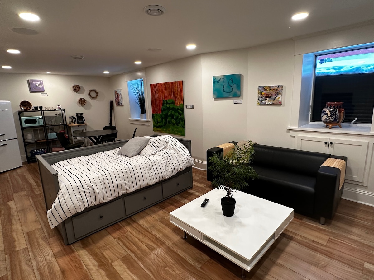 Discover an ideal retreat in this well-designed suite. Unwind on a plush queen Casper bed for a restful night. Indulge in a luxurious full bath with complimentary bathrobes, stunning floor-to-ceiling tile and heated floors. Start your day with freshly brewed coffee in a fully equipped kitchen, featuring a stove, oven, microwave, tea kettle, and a spacious fridge with a freezer. Explore the beauty of White Bear Lake, one of the Twin Cities largest lakes. This Airbnb stay is sure to be memorable.