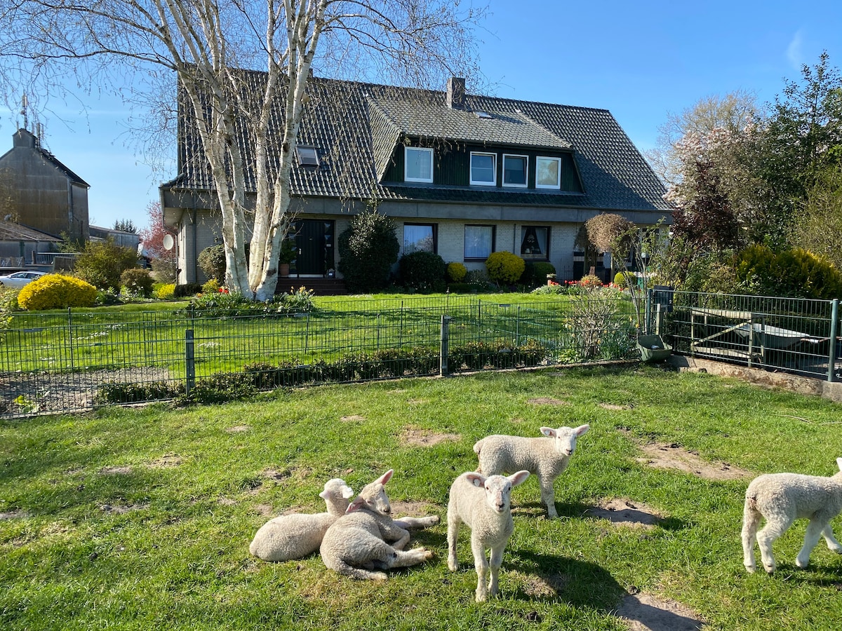 Urlaub auf dem Land ! Kleine Dachgeschoßwohnung auf einem Bauernhof. Husum und Friedrichstadt sind ca. 10 Autominuten entfernt. Hier auf Eiderstedt sind wir der Nordsee nahe. Parken ist direkt neben dem Eingang möglich. Die Wohnung bietet Raum für bis zu 3 Personen. Im Schlafzimmer ist ein Doppeltbett + Einzelbett vorhanden, sowie ein Schlafsofa im Wohnzimmer. Wir sind eine vierköpfige Familie und betreiben einen kleinen Hobby-Bauernhof mit Rindern, Schafen und Hühnern (kein Streichelzoo).