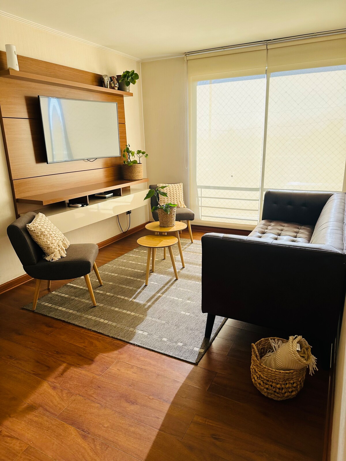 Relájate en este espacio pensado en ti, disfrutaras de un lugar tranquilo, elegante, acogedor y con todas las comodidades para que pases la mejor estadia en nuestra ciudad. A poca distanca de supermercados, centros comerciales, cefam... VIAJA LIVIANO! En este departamento encontrarás todo lo necesario para tu estadía; té, café, azúcar, endulzante, aceite, sal, papel higenico, shampoo, jabón, toallas, secador de pelo, sábanas, plancha, lavadora-secadora, queremos que te sientas como en casa.