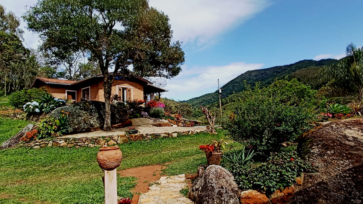 Casa romântica e charmosa. Perfeita para casal, casal com filhos (até 2, no máximo) ou para até 3 pessoas com intimidade, pois só há um banheiro. Sítio de 2 alqueires, localizado aos pés da Serra da Mantiqueira, com vista para Serra do Mar. Há lago, sauna, ofurô e um maravilhoso ribeirão com águas cristalinas. Privacidade, sossego e dias especiais!