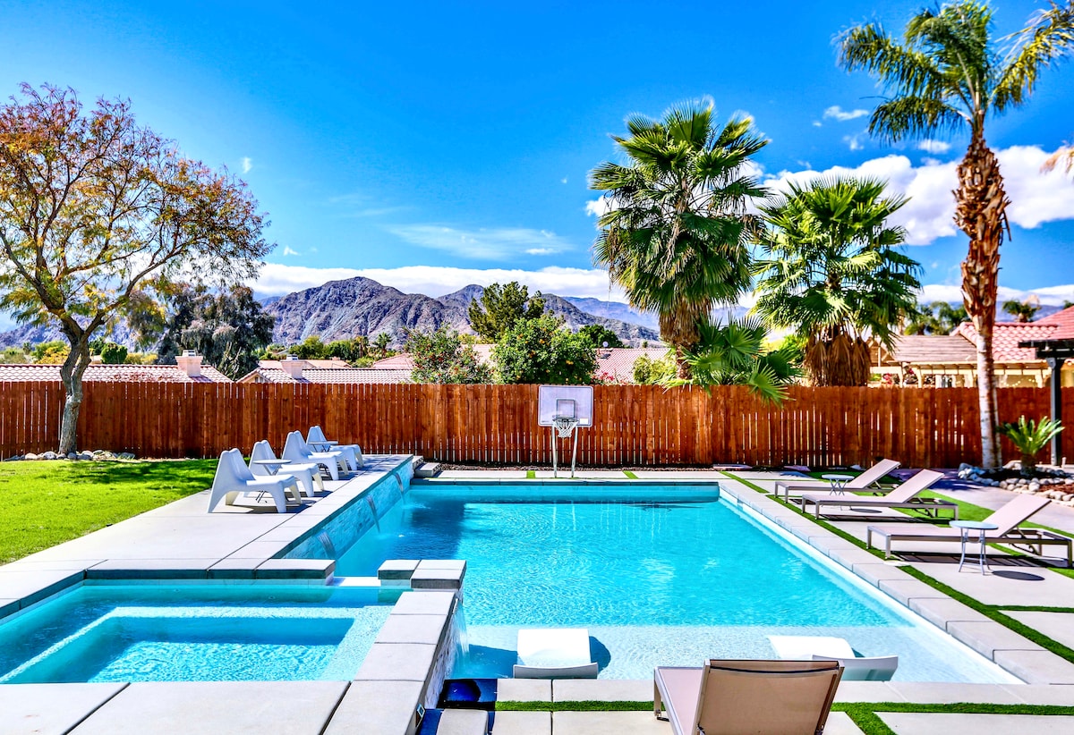 Huge (20'x40') heated/cooled salt-pool/spa with tanning deck/basketball hoop. Putting green/fire pit in huge backyard (0.32 acre) surrounded by unobstructed mountain views. Big patio w/dinning table for 10, 6 burner bbq grill/pingpong/cornhole. Airhockey/Foosball/65" TV w/ YoutubeTV/Netflix/Disney+. A fully-stocked gourmet kitchen, purified water, Nespresso machine. Hotel-style amenities. Close to all stores, restaurants, Tennis and Coachella. No party allowed. LIC-067667