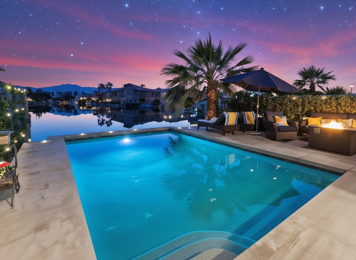 Welcome to Lakefront Dream, a Vue Vacations home! Here you’ll experience panoramic mountain views, stunning desert sunsets, and true lakefront living. Located on a corner lot in the gated community of Terra Lago, this gorgeous two-story home is one of the few with a large patio, unobstructed views, and complete privacy. The back patio is the centerpiece — a true showstopper featuring a designer infinity pool and spa that flow seamlessly into the lake, a MISTING SYSTEM to stay cool, a built-in BB