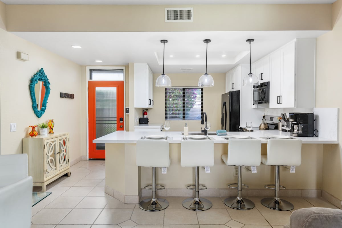 Welcome to your Island Away-Seas! Tropical minimal with a hint of mid-century modern, the Mango House will give you the cabana vibes you need to unwind from daily life. Perfectly located in between Palm Springs (20-25 min ride), Coachella Valley (15 min ride), and Joshua Tree, a 40-min scenic cruise, relax on the deck while enjoying the beautiful lake view against the desert mountains. You will have full access to all of the resort amenities including the healing mineral pools, gym & more!