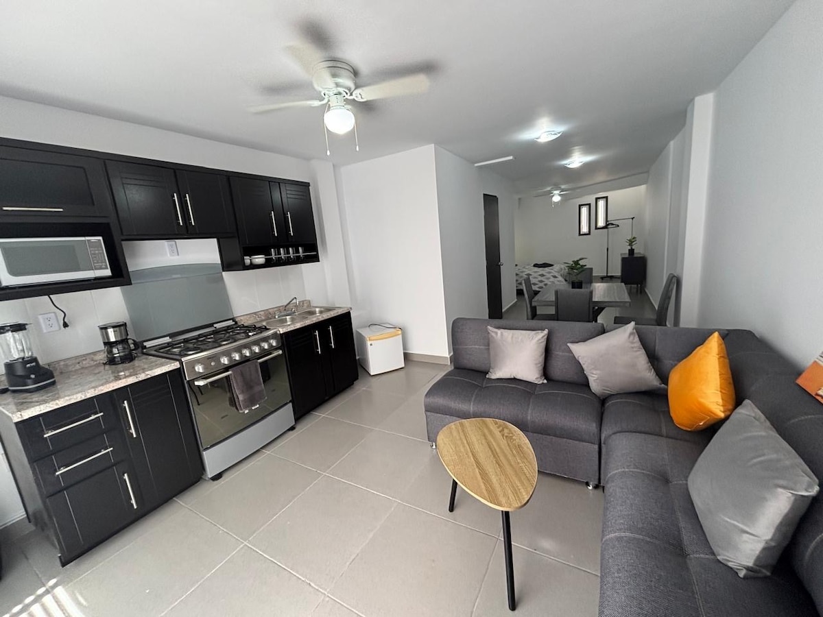 Departamento de una recámara, muebles nuevecitos, moderno, acogedor y céntrico, entrada accesible, la sala comedor y recámara cuentan con un abanico tipo ventilador para darle una temperatura agradable. La cocina cuenta con estufa y horno para cocinar; además de utensilios para cocinar, y tomar sus alimentos. El comedor es amplio, para cuatro personas. Este departamento con una habitación está ubicado junto a la plaza comercial Norte y múltiples servicios.