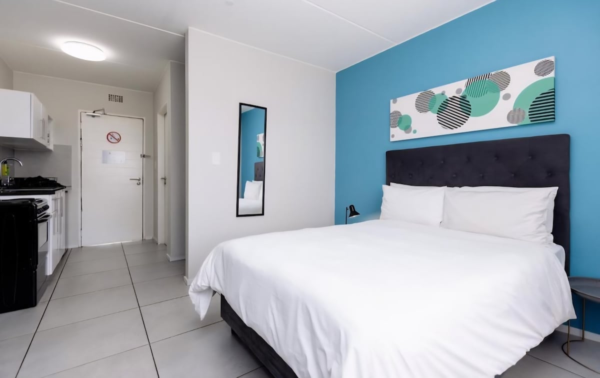 BlackBrick Sandton is located 800m from the Sandton Gautrain station and 400m from the ICC at 25 Fredman Drive in the heart of Sandton CBD. The spacious Suites feature an en-suite Bathroom, High-speed WiFi, Air-Conditioner, Smart TV, Fully Equipped Kitchen, Lounge, Work Desk, USB Chargers, Block-out Curtains, Smoke Detectors, Laptop Safe, Full-size Fridge, Energy Saving Technology all within a fresh and clean Apartment with high ceilings and high-end design.
