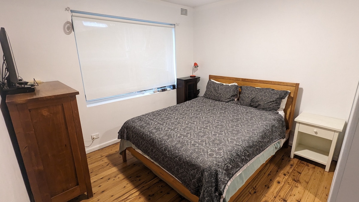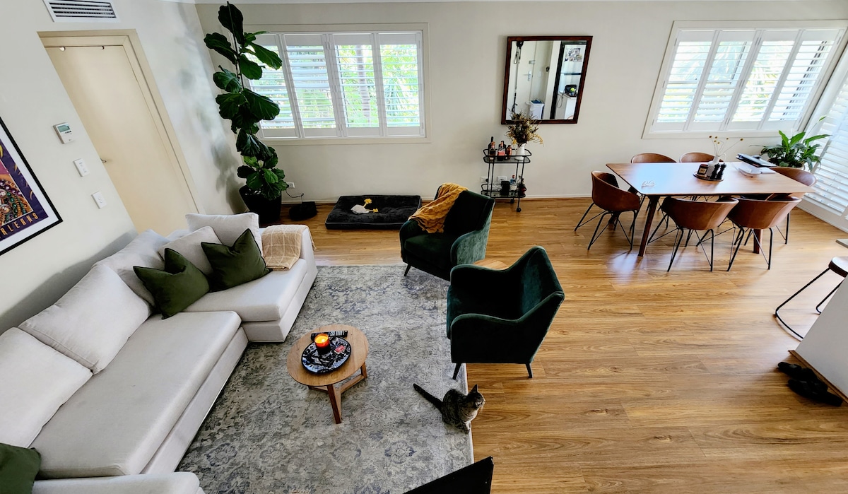 Close to iconic Coogee Beach (a 15-minute walk) but even closer to the hip bars, cafes and cinema of 'The Spot' in Randwick. This one-bedroom apartment is comfy and quiet with a leafy outlook. It has lots of natural light, high ceilings, large windows and a galley-style kitchen with dishwasher. Bathroom is clean but in original condition. There is a desk but no dining table. It's downhill from the street so there quite a lot of steps. This is my home so expect my personal touches.
