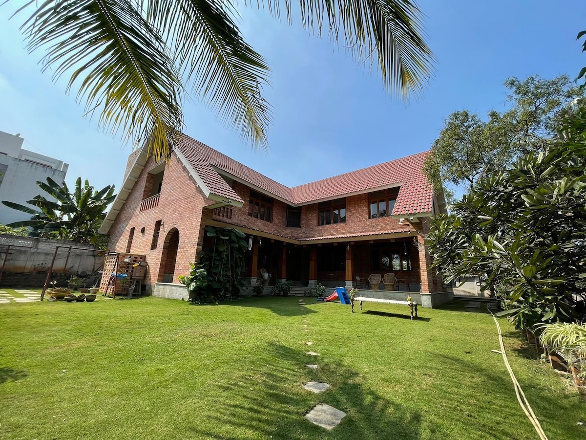 Thrilling escape to our 3BHK wooden cottage, just 25 mins from ORR! Nestled in a serene community with lush lawns, a clean sparkling Private pool, and a gazebo for epic village views. Secured with a watchman, it’s perfect for weekend getaways or parties! Enjoy a campfire, BBQ, projector, Carrom, chess, cricket & a speaker with karaoke. Fully equipped with kitchenware, RO water, Power Generator. 2-min walk to Browntown Resort’s Restaurant & Spa. Touch the grass, recharge, & bond with loved ones!