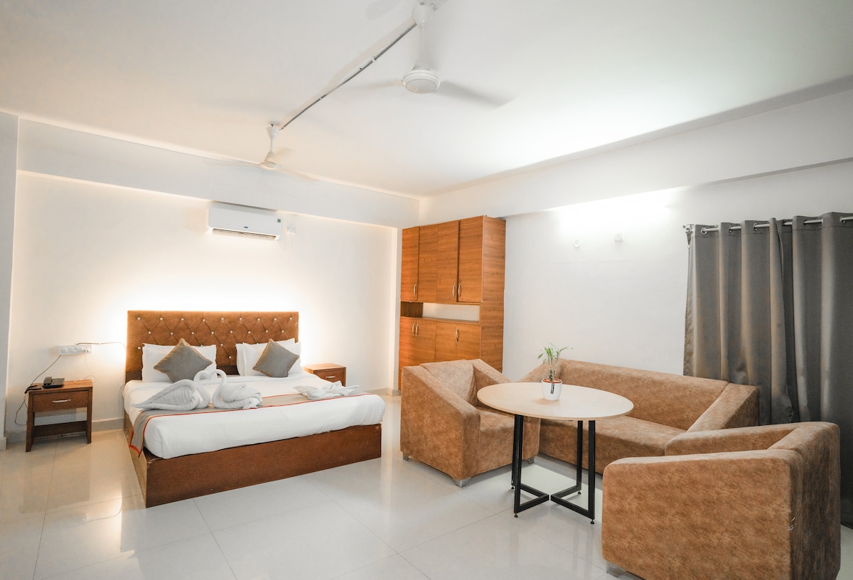Enjoy a stylish experience at this centrally-located place on the 8 th floor with magnificent views . This has good restaurant downstairs and easy access to ORR (airport ) . Centrally located to major IT companies, Hospitals , financial district and good for travels from across the world with mind blowing interiors .New property with quality .