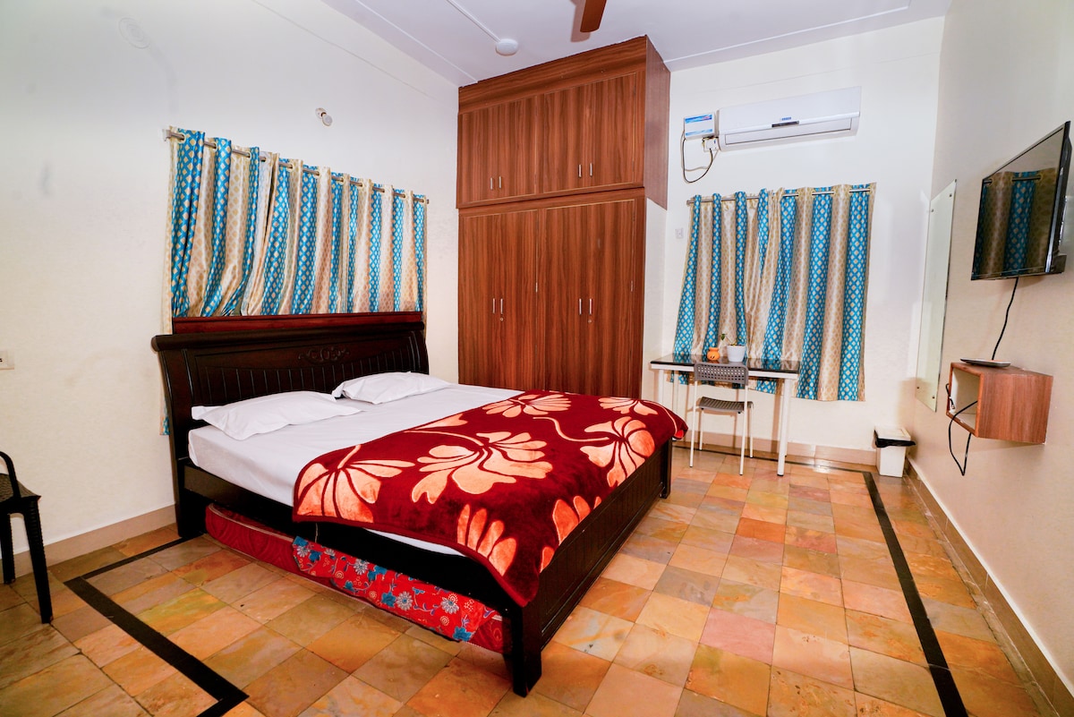 Forget your worries in this spacious and serene space nestled in the heart of the city of Hyderabad, MLA Colony, Banjarahills. Our scenic 3 BHK(AC) apartment offers the perfect blend of convenience and tranquility. Located in a calm neighborhood, away from traffic/pollution it’s just minutes away from popular malls, shopping centers, hotels and hospitals. With all the basic amenities it ensures a comfortable stay for your family. Whether you're here for work or leisure, you'll feel right at home