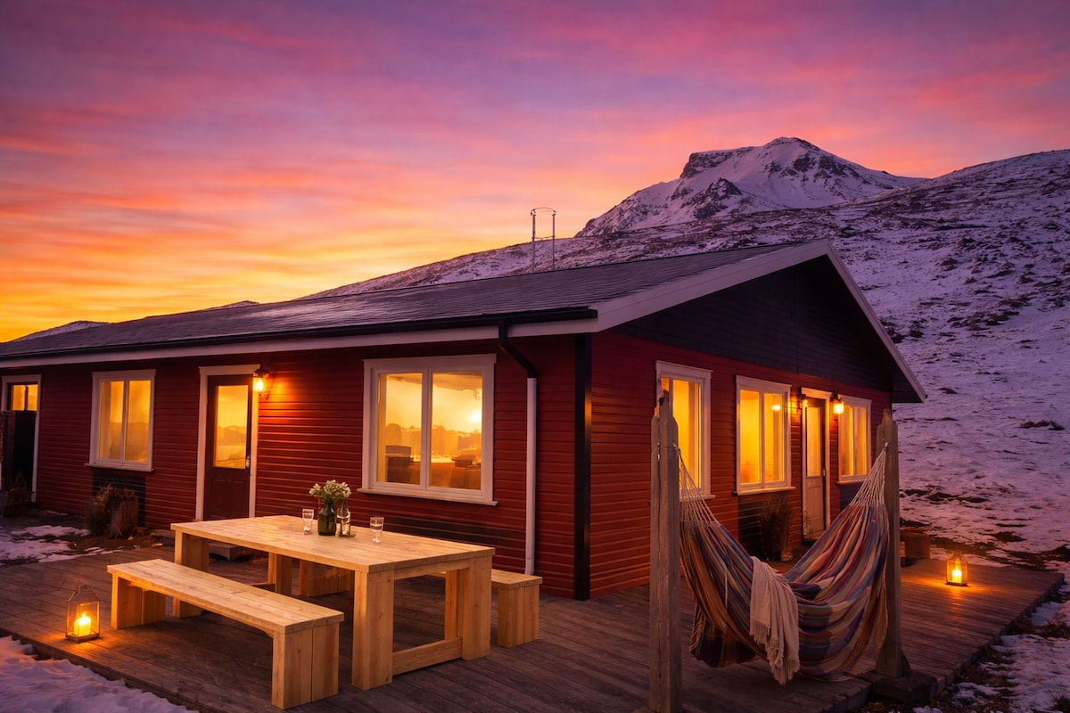 Recent build cottage in the south of iceland, located just outside the small town of Hvolsvöllur, only 3 km from the town. we offer you a relaxing stay with a great view of volcano Hekla, there is much to see close to Hvolsvöllur, for example volcanos like Eyjafjallajökull, waterfalls like Seljalandsfoss or Skógarfoss. the cottage is fitted with a kitchen but if you don't feel like cooking there are resturants to choose from in the area.
