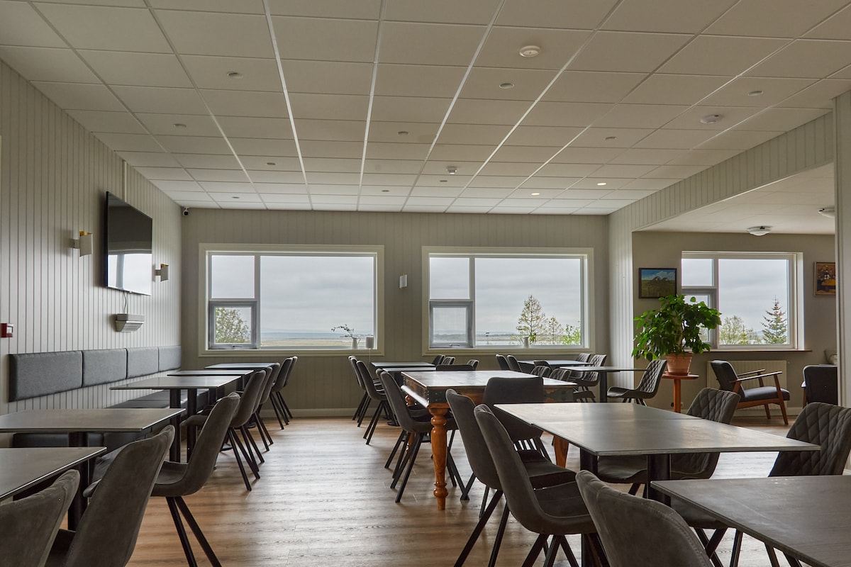 All rooms have a private bathroom and a refrigerator with a freezer for guests to store beverages and groceries, as there is no traditional bar, though a limited wine and beer selection is available. Relax in our hot tubs from 15:00–21:30 after exploring the area. Breakfast is continental only. Nearby are restaurants like Mika, Friðheimar, and Vínstofa Friðheima within walking distance. Laugarás Lagoon, 10 km away, also has an in-house restaurant. See photos.
