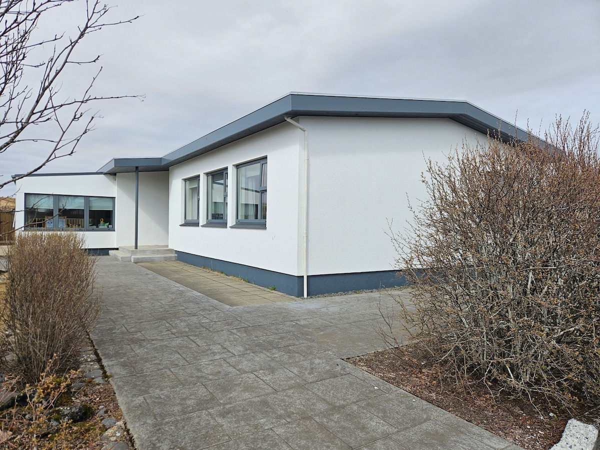 This beautiful house is 48 m2 and has a fully equipped kitchen connected to a living room with a cozy sofa, chair and TV corner. Both in the living room and the bedroom the northeast side has windows from floor to ceiling with magnificent panorama view of Hekla, Eyjafjallajökull and the Westmann Islands. The house holds a bathroom, entrance and a wide porch, towels, double bed with linen, WIFI and everything you need for your stay. It is located 15 km from Hella and 90 km from Reykjavík.