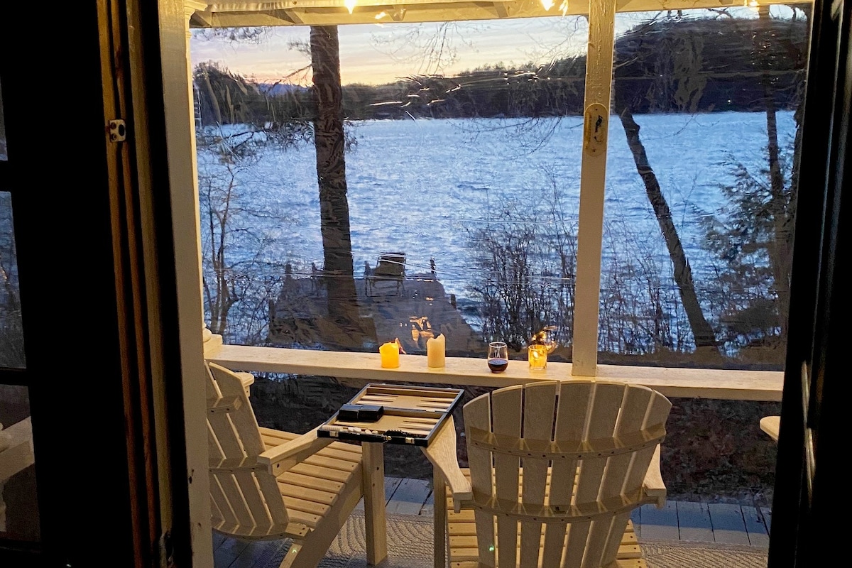 私人湖畔别墅、火坑和迷人的日落景色
