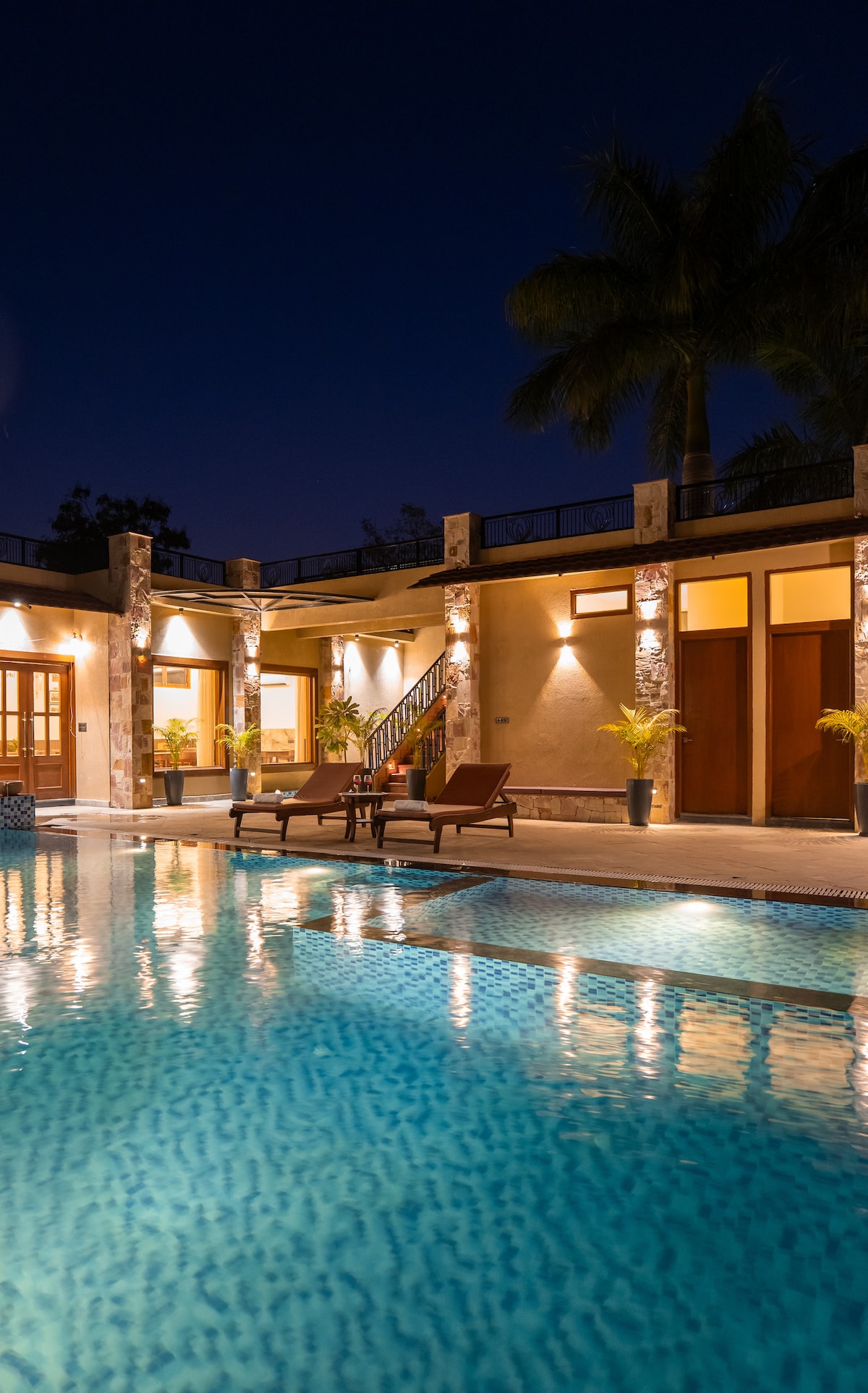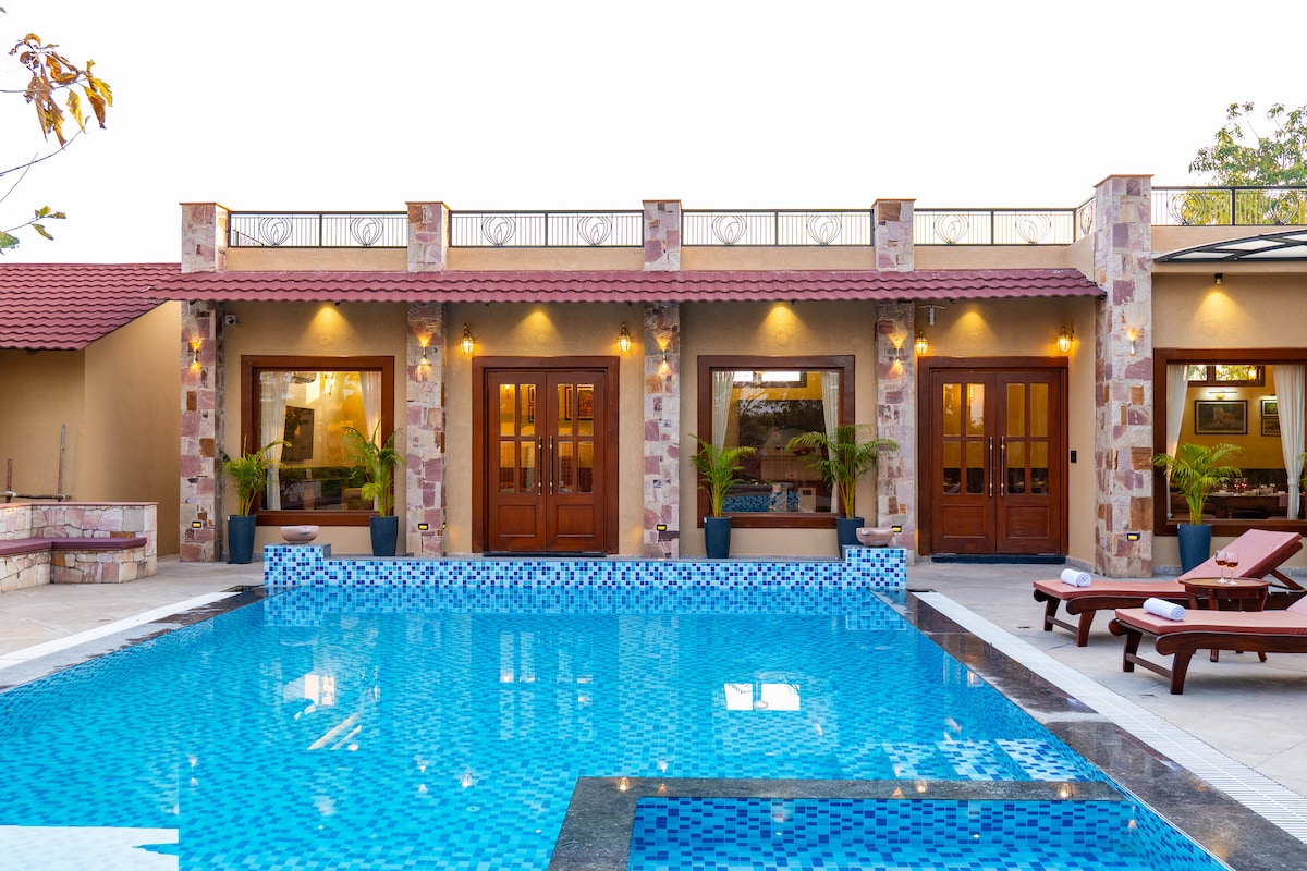 Located on the main Ranthambore Road, just minutes from the National Park gate, this pet-friendly retreat offers the perfect blend of wilderness and comfort. Warm interiors, elegant lighting, and inviting seating create a soothing ambience. Step out to your private plunge pool and covered sit-out with lush green views. Landscaped gardens, a stunning common pool, and a stylish lounge make it an ideal forest escape near Ranthambore Fort and Ganesh Temple.