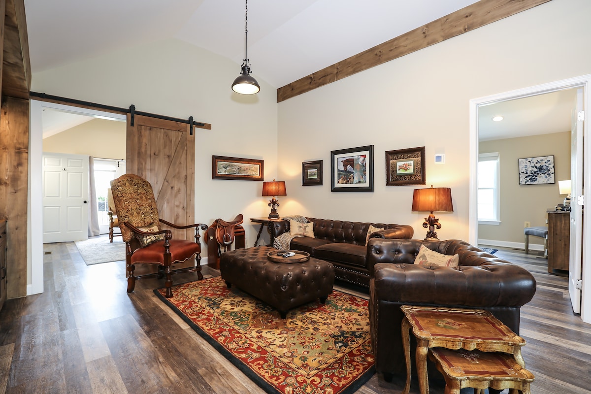 Residence above 5-stall horse barn. Two bedroom house with 2 bath, Juliette balcony, vaulted ceilings, fully appointed kitchen, laundry. Traditional English equestrian decor, with horse shows & fox hunts close by. Pool open 5/15-10/15. Extra guests $55/night. Pet fee $35 each. Please advise through Airbnb. Lovely antiques, equestrian art & decor, warm rugs. On site also~AirBnb: www.airbnb.com/rooms/826639006057875355?guests=1&adults=1&s=67&unique_share_id=4cdf4b76-3173-498a-9287-5ab54a38b4ee