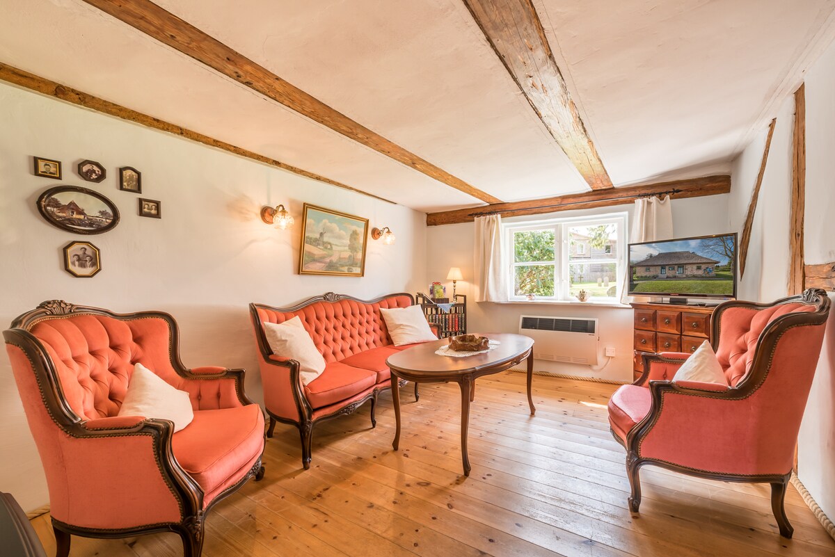 This charming thatched-roof house on Rügen is nestled in nature and features a natural swimming pond and a sauna. The cozy interior blends rustic charm with modern comfort, making it ideal for couples or families seeking relaxation. It offers spacious living areas, a fully equipped kitchen, and stunning views of the surrounding landscape. Perfect for hiking and exploring the island.