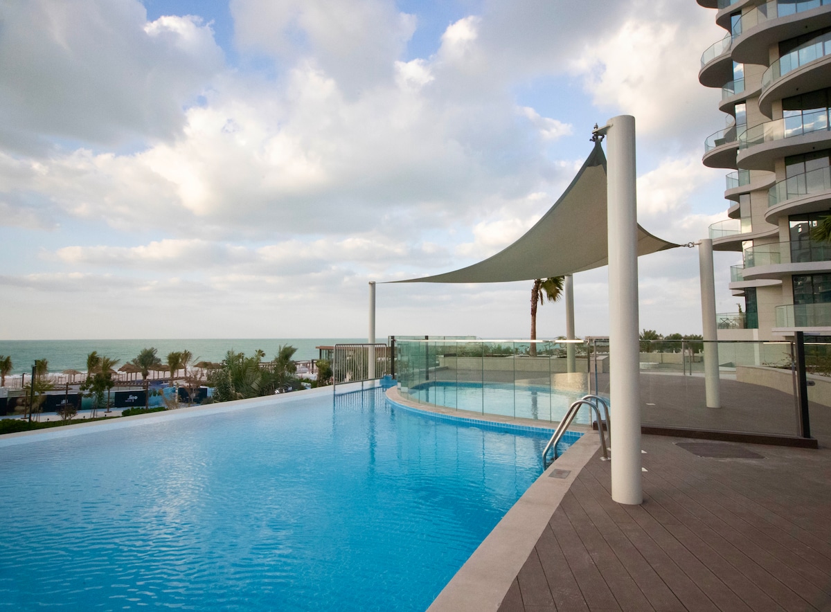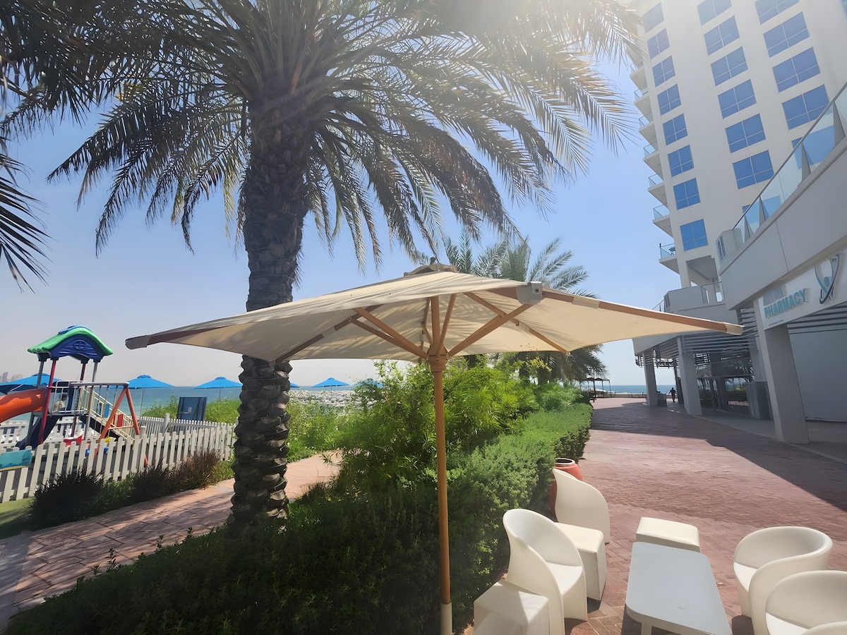 Fully renovated one-br suite steps from the free Beach, Golf course, Marina and close to luxury hotels Ritz Carlton, Waldorf, Hilton. 20 m. drive to Hajar Mountains. 24 hours Concierge/lockbox access. Free Parking. Free: Gym, pool ,kids pool and 2 kids play areas . Gorgeous large terrace with lounge seating and full sea view. Sleeping: 1 King size bed+ 2 sofa beds. Kitchen: cooker, w/machine, Fridge, Nespresso, toaster. Other: Wifi, 55' Smart TV , Netflix, beach towels, umbrella