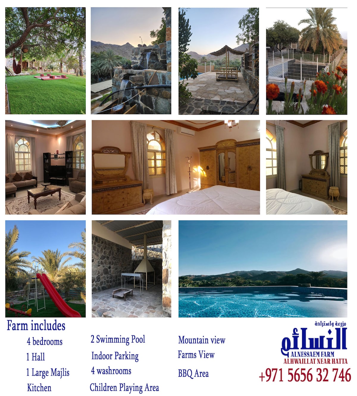 Enjoy a quiet stay in a beautiful house on a private farm surrounded by trees and green spaces with a private pool . The place is ideal for families and those seeking to relax away from the hustle and bustle of the city. The house is fully equipped (3 comfortable rooms, kitchen, outdoor seating, grill). Close to services and main roads, it’s an easy drive from dubai ,it offers a great view of nature. An authentic rural experience with luxury and comfort in the middle of the desert