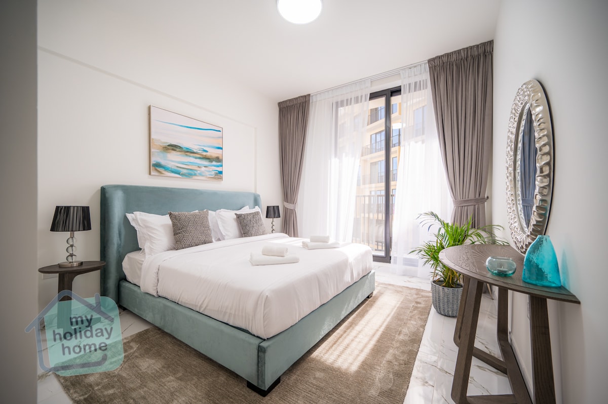 Fully renovated one-br suite steps from the free Beach, Golf course, Marina and close to luxury hotels Ritz Carlton, Waldorf, Hilton. 20 m. drive to Hajar Mountains. 24 hours Concierge/lockbox access. Free Parking. Free: Gym, pool ,kids pool and 2 kids play areas . Gorgeous large terrace with lounge seating and full sea view. Sleeping: 1 King size bed+ 2 sofa beds. Kitchen: cooker, w/machine, Fridge, Nespresso, toaster. Other: Wifi, 55' Smart TV , Netflix, beach towels, umbrella