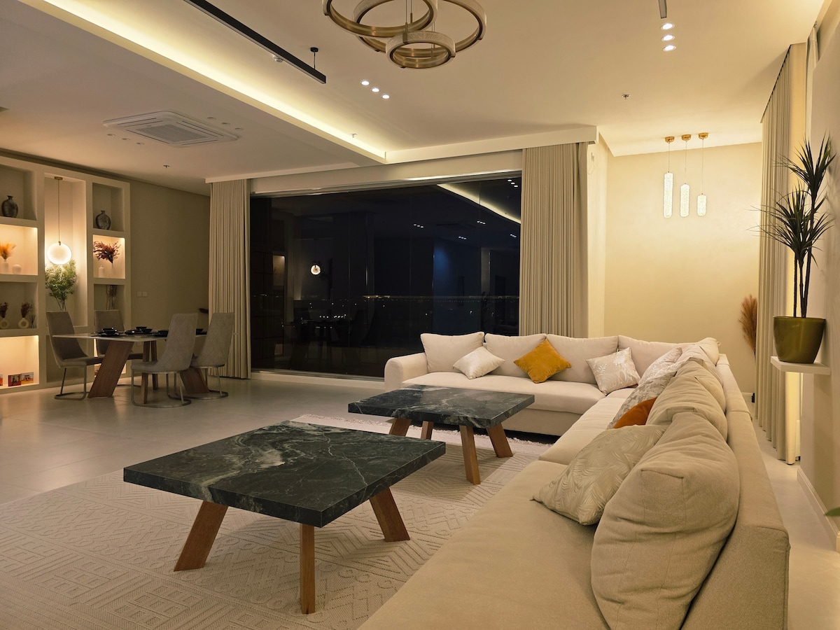 شقة جميلة وواسعة تقع على كورنيش الدمام، بتصميم داخلي عصري. توفر الشقة بيئة مريحة ومثالية للإقامة الطويلة أو القصيرة، مع جميع الخدمات والمرافق الضرورية بالقرب منها. فيها واي فاي الياف وتلفزيون 65 بوصة ذكي يدعم جميع البرامج