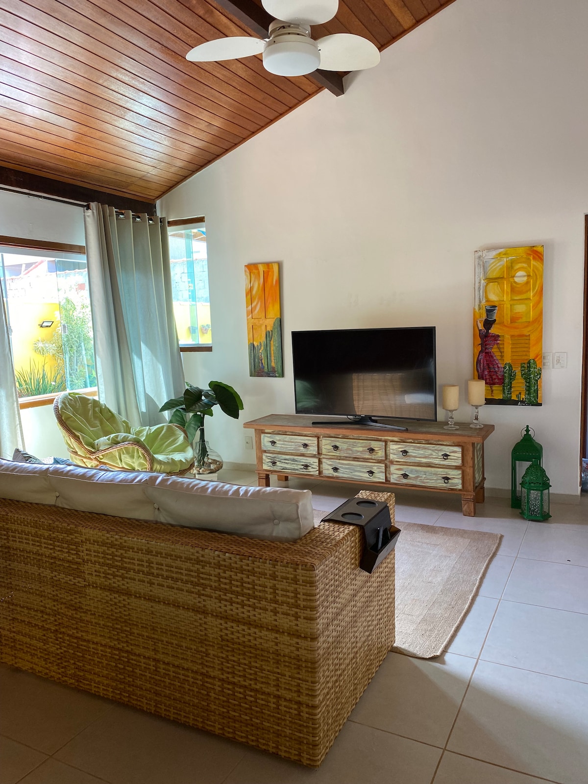 Ensolarada, grande e confortável para sua família curtir e relaxar. A casa tem três salas (TV, estar e jantar), três suítes, varandas, cozinha integrada ao pátio externo, com mesa de refeições, escritório, decks frontal e lateral, churrasqueira, forno Igloo (mineiro), piscina e deck com iluminação. A 600 metros do centro. Linda vista para diversos bairros, centro, Praia do Canto e para o verde. Fácil acesso a pé à Rua das Pedras, à Orla Bardot, às praias Forno, Foca, Ferradura, Brava e Canto.