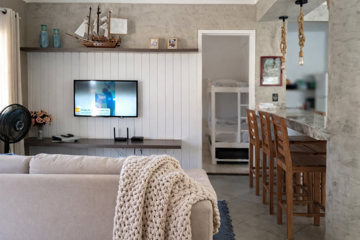 Agradável casa, pé na areia, em frente ao mar de Arraial do Cabo. Estamos a 6 km, 11 minutos, do aeroporto de Cabo Frio-RJ. O espaço conta com uma suíte (vista para o mar), com ar condicionado, cama de casal, e um bi-cama com dois colchões de solteiro. O quarto 2 (não suíte), com ar condicionado, cama box de casal, com duas camas auxiliares de solteiro. Há cozinha equipada, área de serviço completa, 2 banheiros completos e sala com sofá-cama e TV. Eventos ñ são permitidos. Insta: @amar_casa