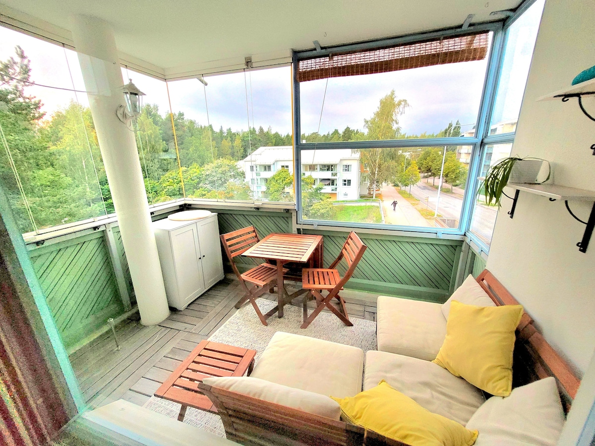 Take it easy at this unique getaway and enjoy your stay in this fairly new 34 m2 condo & studio (+13 m2 balcony). Calm neighborhood with excellent transportation connections makes accommodation comfortable and makes you feel like home. The bus stops are located right near near the apartment and the metro station is only a 5-minute walk away (450 meters from the apartment) which takes you to the city center within 12 minutes.