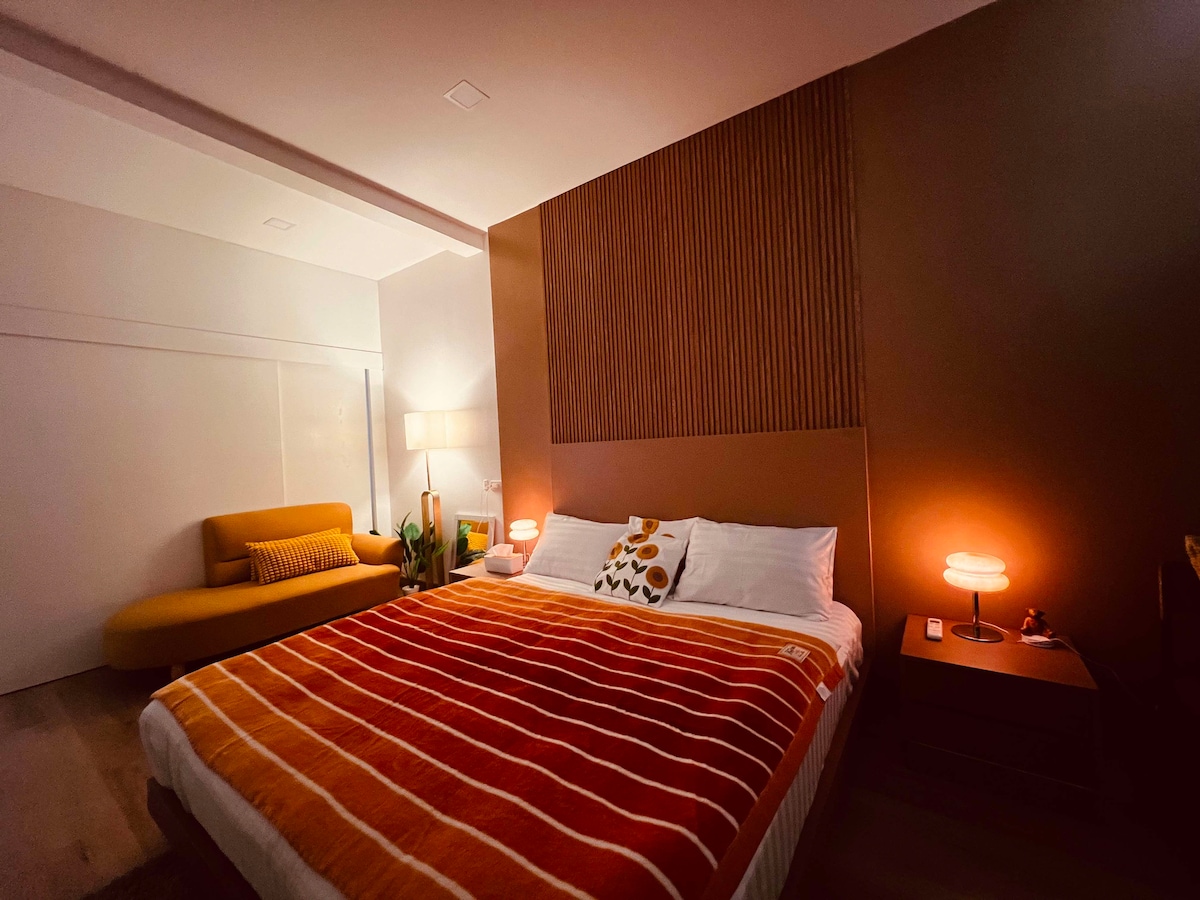 This beautiful Japanese-inspired 60 sqm unit has everything you need for a pleasant stay. The bedroom king-sized bed and personal workspace, and opens onto a spacious semi-outdoor bathroom with a wooden ofuro tub that fits two, and leads to a large walk-in closet. The living room includes a cozy sofa bed and a Ultra HD Smart TV. The kitchen is well-equipped with a microwave, range-hood, electric hob and refridgerator. The large picture window offers a view of the gardens and swimming pool.